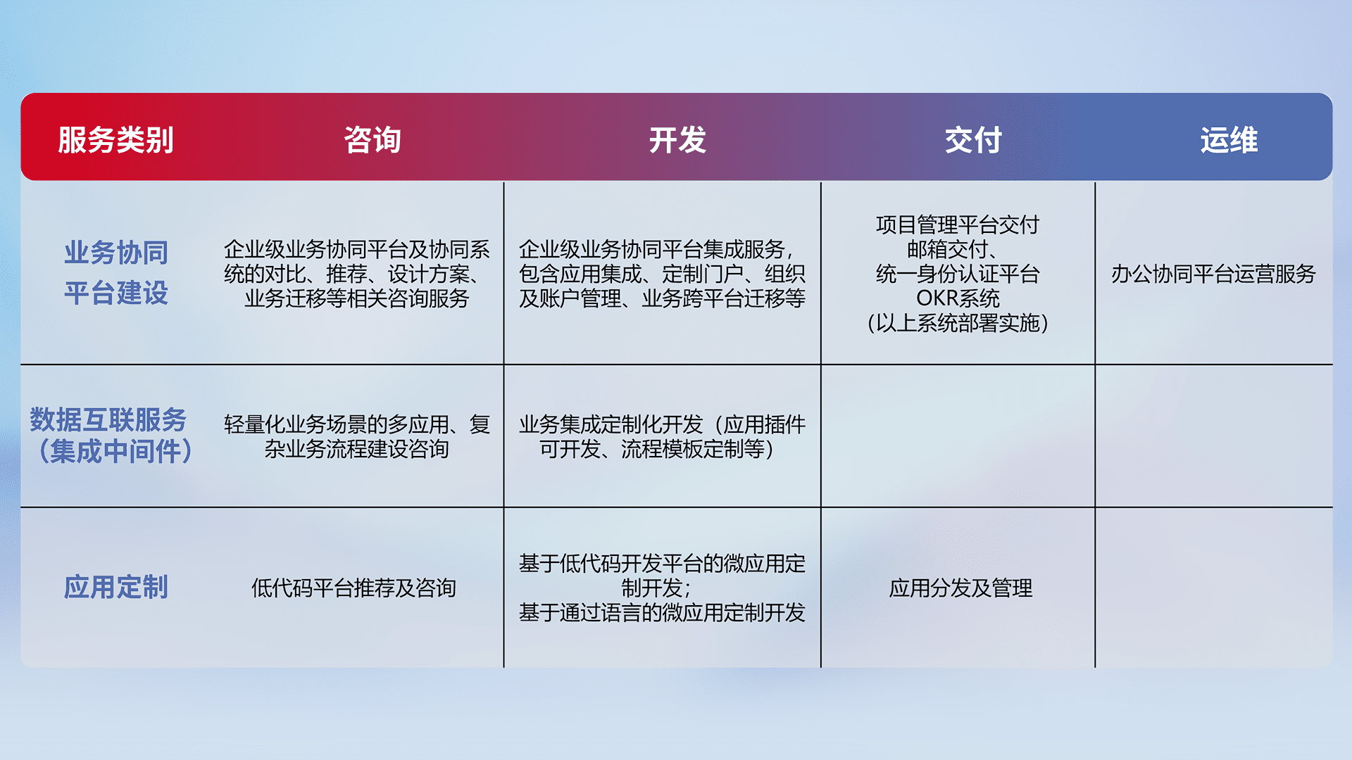 针对钉钉、、、企微、、、、IDaas等平台级产品提供产品的规划、、方案、、交付、、、定制化开发等服务,,,实现如统一协同办公、、智能客户服务、、、混合会议管理、、、、智能数据查询、、、、等业务场景,,,实现数字化转型。。。。